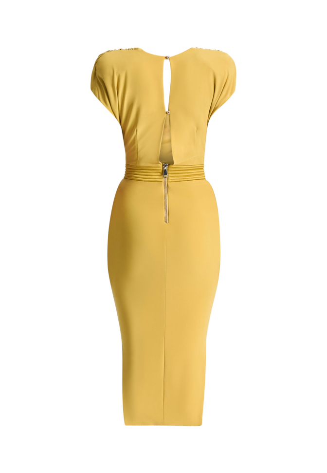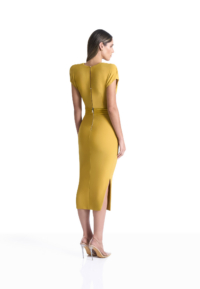 The stretch jersey provides comfortable, confident coverage across the body. Satin detailing enriches the silhouette without distraction, preserving the dress’s clean lines and architectural intent. The design accommodates discreet underlayers if preferred, allowing personalised coverage without compromising the overall silhouette.