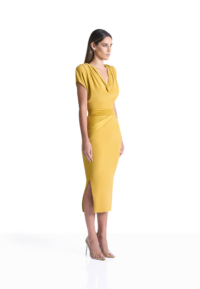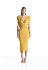 Cut in stretch jersey, the Ilium Dress is designed to follow the body’s natural line without restriction, allowing fluid movement while maintaining refinement. The cowl neckline drapes gently across the upper body, softening the silhouette without diminishing structure.