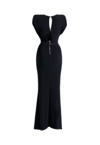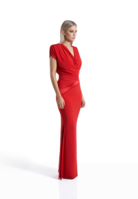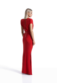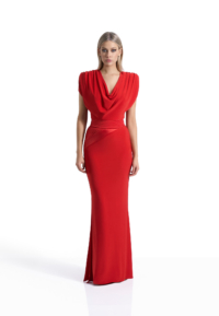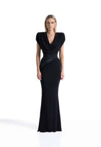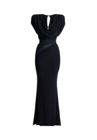 A STRETCH JERSEY COWL NECK GOWN WITH STITCHED SATIN WAISTBAND AND SIDE PANEL, SIDE SPLIT AND SHOULDER ACCENTS