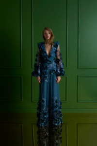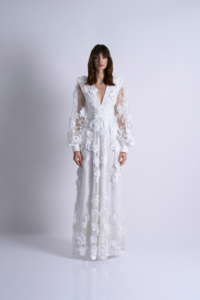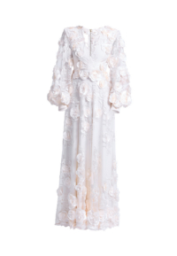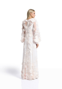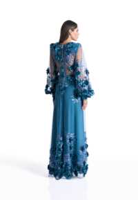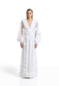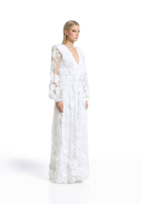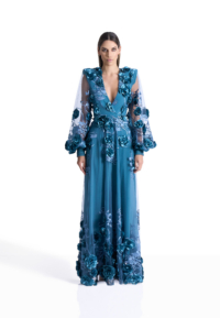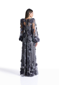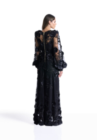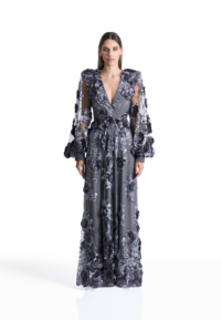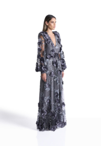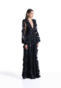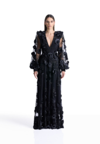 The Chimera Gown is defined by contrast and control. A deep V neckline brings clarity to the bodice, while dimensional floral appliqué drifts across sheer layers, creating depth and movement without excess. Structured through the waist and fluid through the skirt, the silhouette feels both strong and softly expressive.