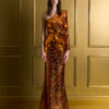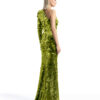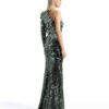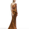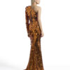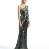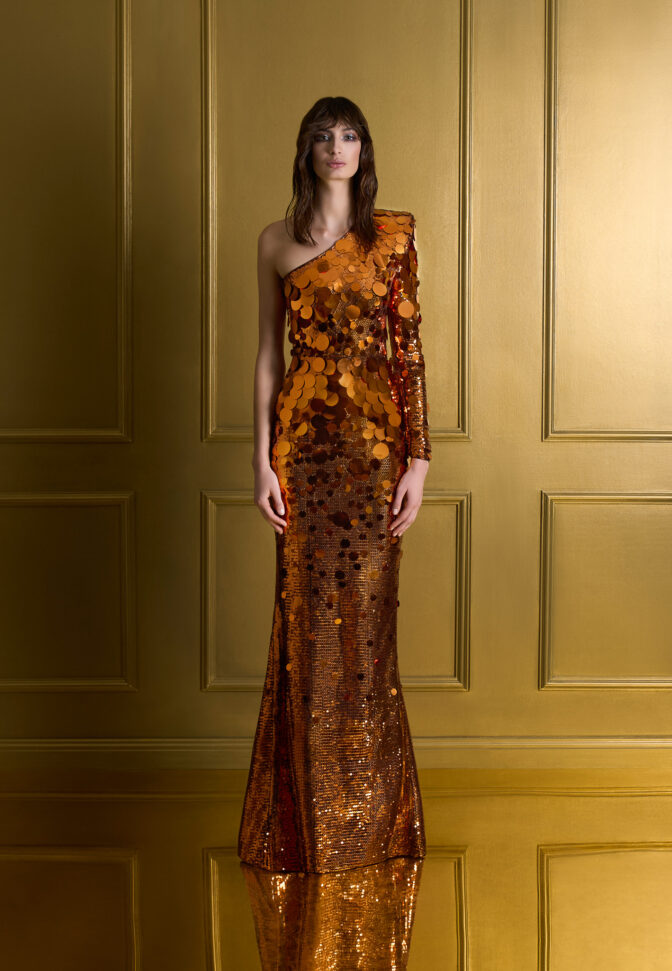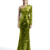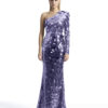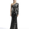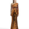 A ONE SHOULDER, LONG SLEEVED GOWN IN STRETCH DISC SEQUINS AND SHOULDER ACCENT