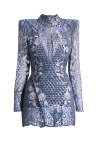 The Echo Mini Dress is crafted in embroidered mesh lace, bringing depth and dimension to a sculpted mini silhouette. The intricate embroidery creates refined surface detail while maintaining clarity of form. The clean proportion of the mini length keeps the silhouette modern, balanced, and intentionally composed.