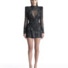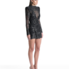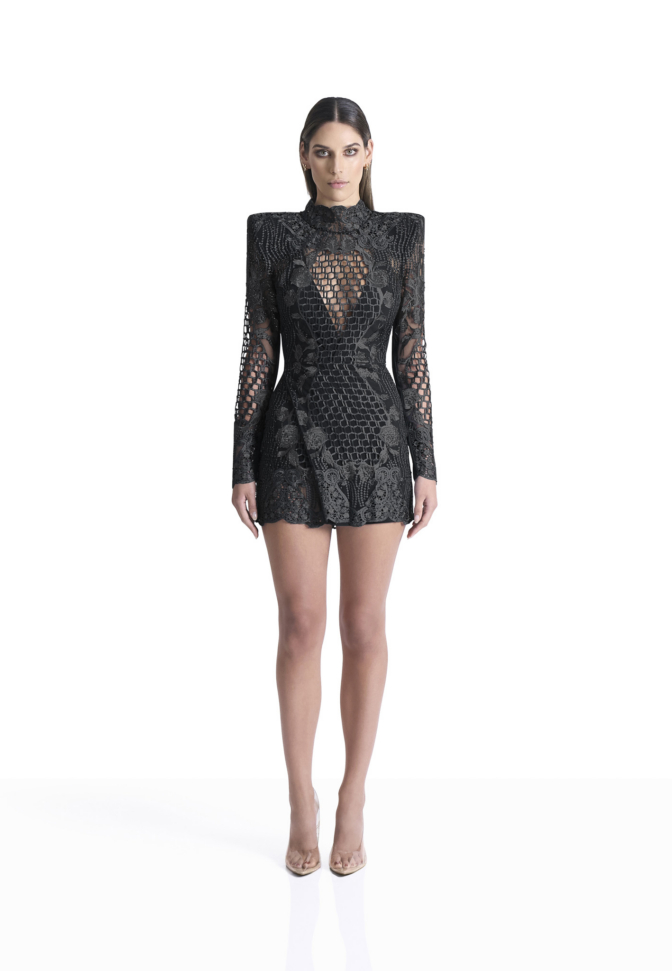 The Echo Mini Dress is crafted in embroidered mesh lace, bringing depth and dimension to a sculpted mini silhouette. The intricate embroidery creates refined surface detail while maintaining clarity of form. The clean proportion of the mini length keeps the silhouette modern, balanced, and intentionally composed.