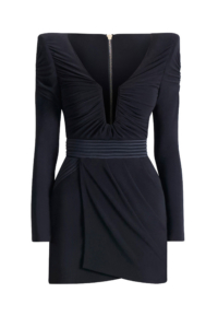Fully lined in jersey, the dress maintains opacity and fluidity beneath the outer layer, allowing the design to move with intention while preserving its clean, elongated line in a mini length that feels both composed and expressive.