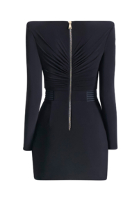 The jersey lining provides smooth, flexible coverage and enhances wearability, allowing the dress to skim rather than cling. The skirt falls fluidly from the waist, creating an elegant mini silhouette that elongates the legs while maintaining composure in motion.