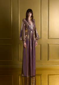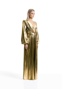 A WIDE LEG EASY FIT MOLTEN JERSEY JUMPSUIT WITH GATHERED WAIST, BILLOWED SLEEVES AND SHOULDER ACCENTS