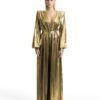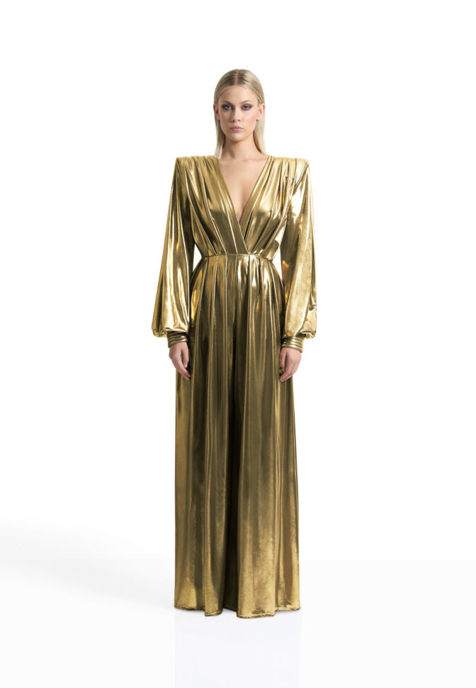 A WIDE LEG EASY FIT MOLTEN JERSEY JUMPSUIT WITH GATHERED WAIST, BILLOWED SLEEVES AND SHOULDER ACCENTS