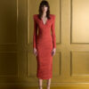 A LONG SLEEVE STRETCH JERSEY DRESS WITH GATHERED BODICE, SIDE GATHERING AND SHOULDER ACCENTS