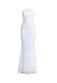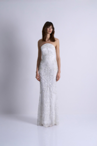 The Ithaca Gown is defined by clarity and control. A strapless neckline frames the body with quiet confidence, while intricate lacework traces a clean, elongated silhouette. Free from excess, the design allows proportion, texture, and precision to speak for themselves.