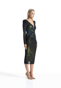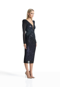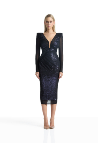 A SHEER GATHERED BODICE MESH MIDI DRESS WITH SHOULDER ACCENTS AND SEPARATE SEQUIN MIDI SLIP – CAN WEAR SEPARATELY