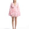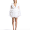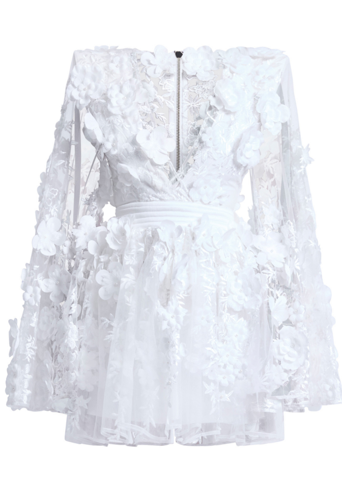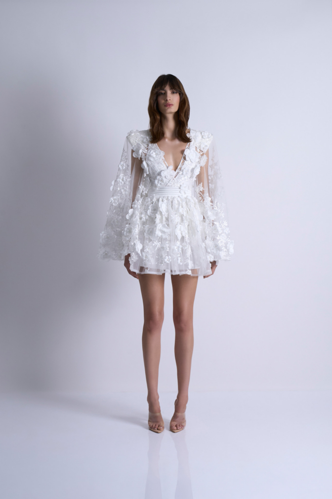 The Isadora Mini Dress captures softness in motion. Layers of sheer tulle are adorned with dimensional floral appliqué, creating texture and movement with every step. A deep V neckline and softly defined waist bring balance to the silhouette, while the mini length introduces a sense of ease and modernity.