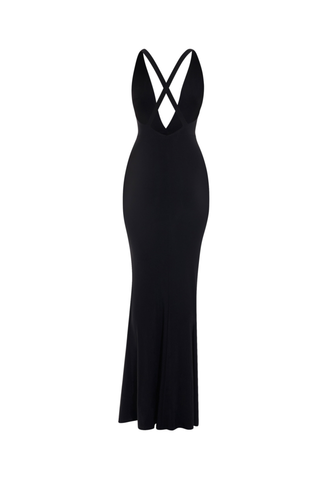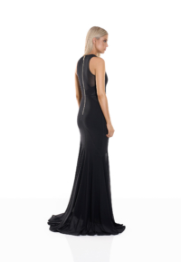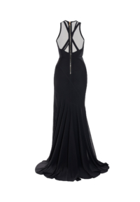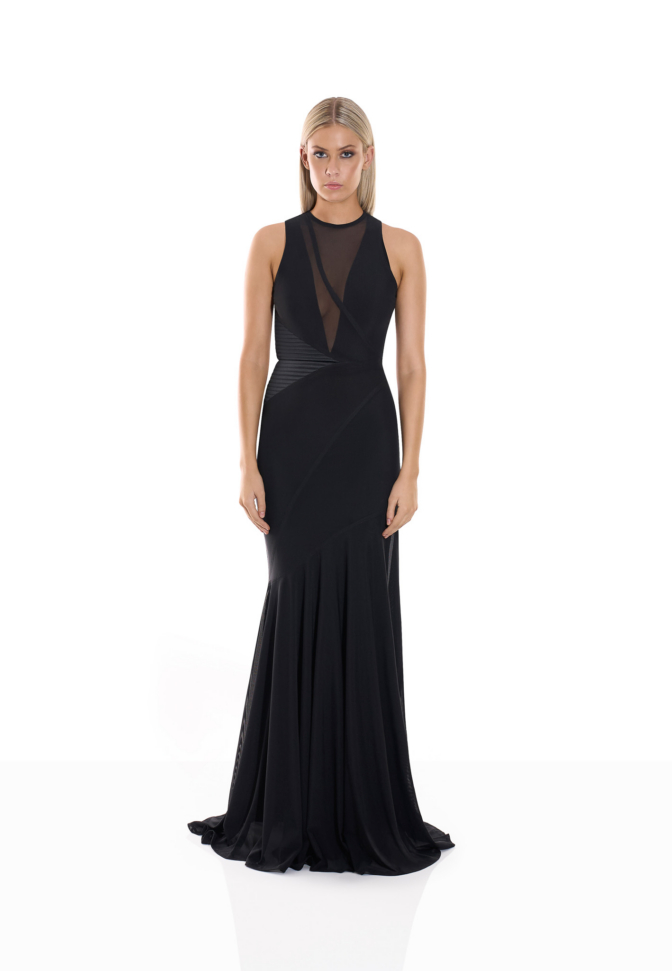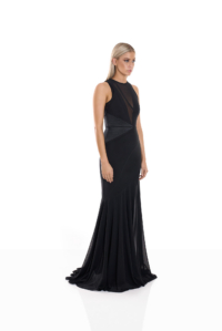 The included sleeveless long slip ensures reliable opacity and comfort beneath the sheer mesh panels, strengthening confidence without disrupting the gown’s fluidity. The gown’s construction harmonises openness and structure: mesh for dimensional rhythm, and slip lining for composed coverage. The result is a silhouette that feels elevated, refined, and intentionally designed to flatter across proportions.