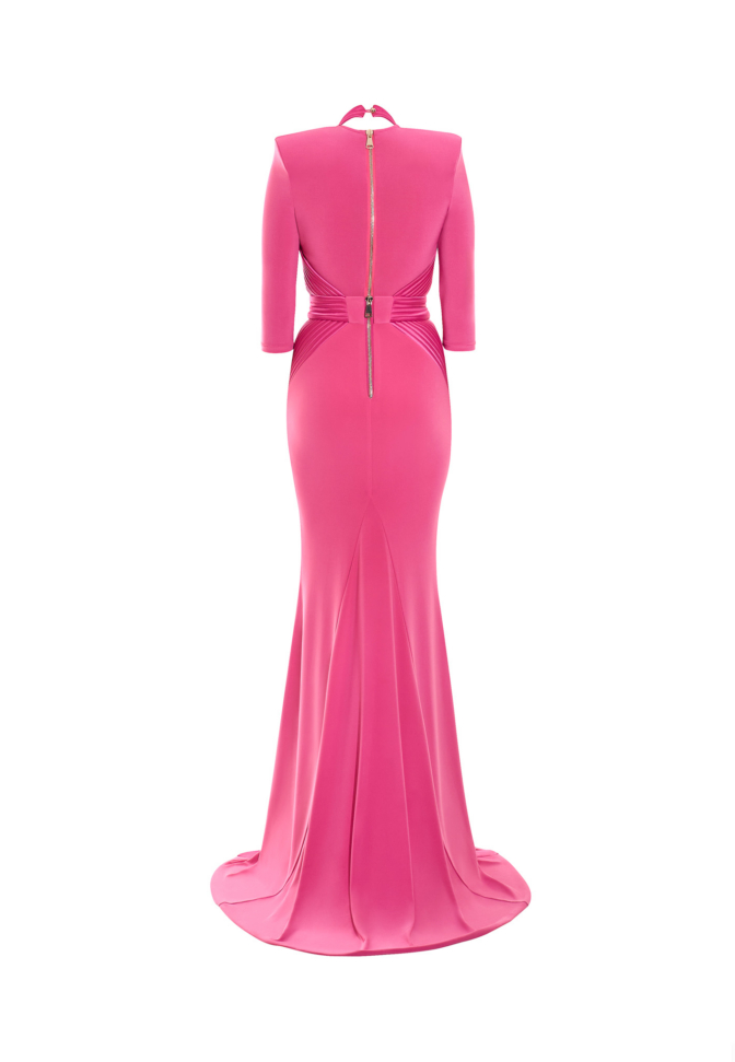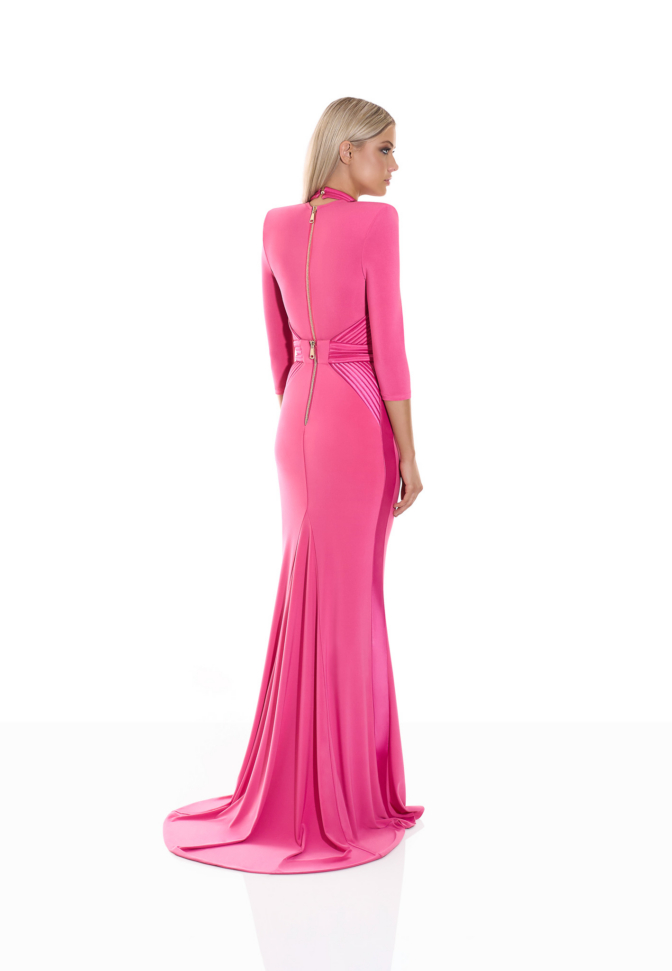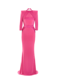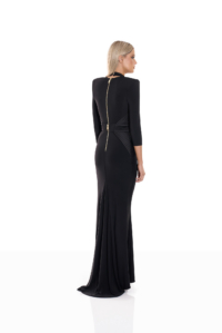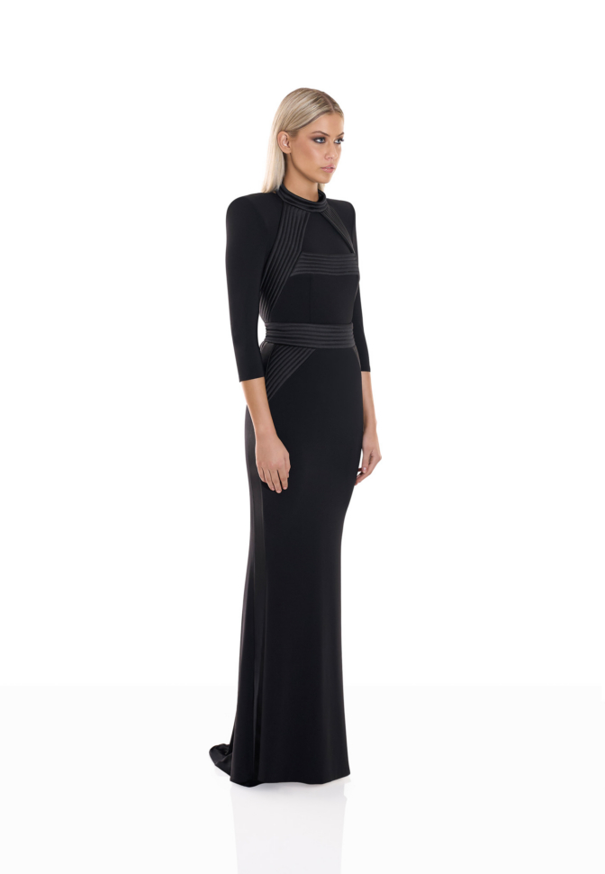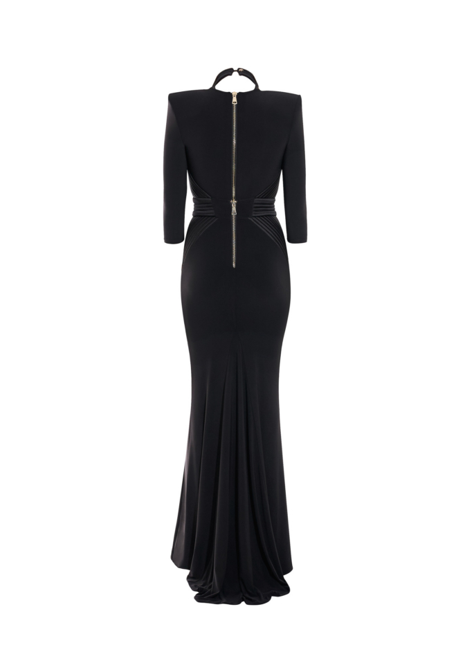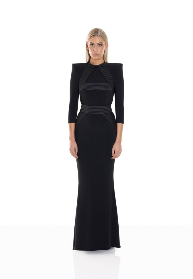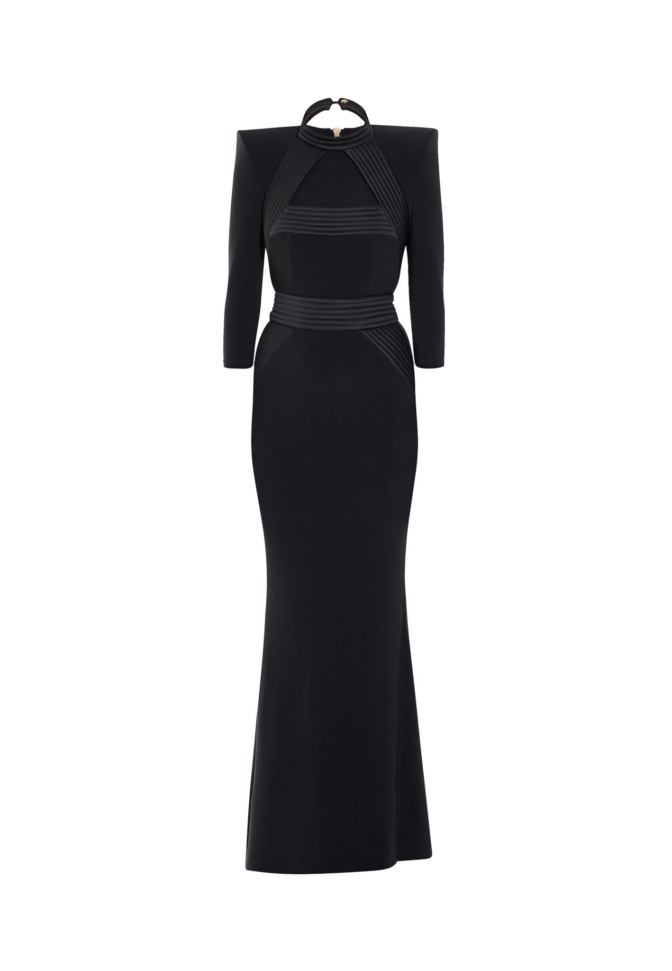Signature stitched accents define the structure of the silhouette, tracing key lines with architectural precision and reinforcing the waist with intentional clarity. The waistband incorporates a discreetly engineered stretch panel, allowing the gown to adapt seamlessly to movement while preserving its sculpted shape. The result is a fit that feels secure, composed, and intuitively tailored to the body.