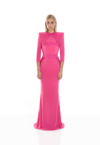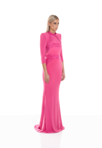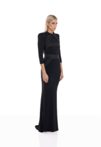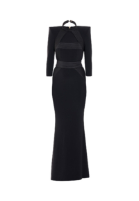 The They Return 2-PC Gown is a study in tension and balance — fluid stretch jersey sculpted by precise signature detailing. A halter neckline frames the shoulders with clarity, while an open décolletage and back introduce confident exposure, controlled through refined construction.
