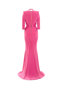 The integrated stretch panel within the waistband introduces controlled flexibility — allowing ease through the midsection without compromising the gown’s architectural clarity. The halter neckline stabilises the upper frame, while the open back remains secure and balanced. The skirt skims rather than clings, flowing with intention and composed movement.