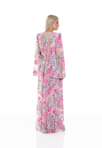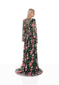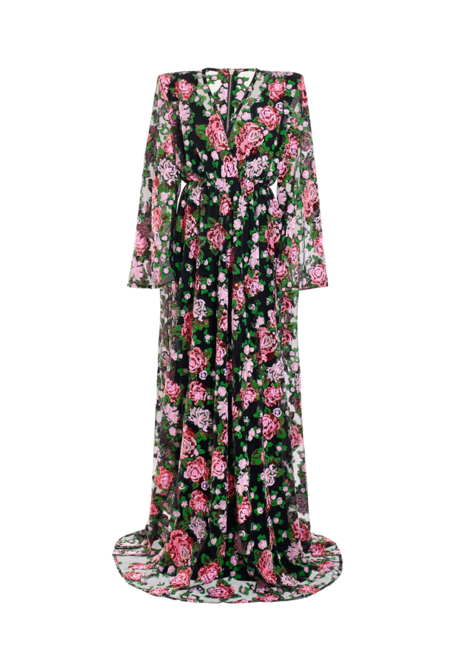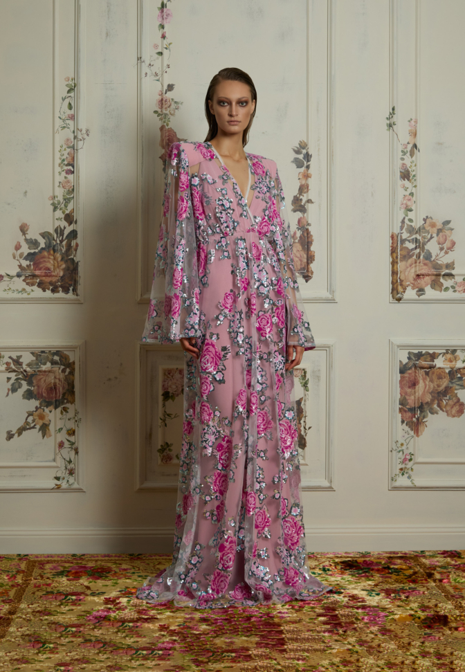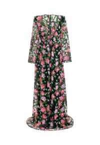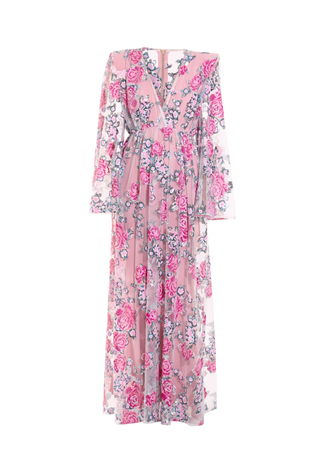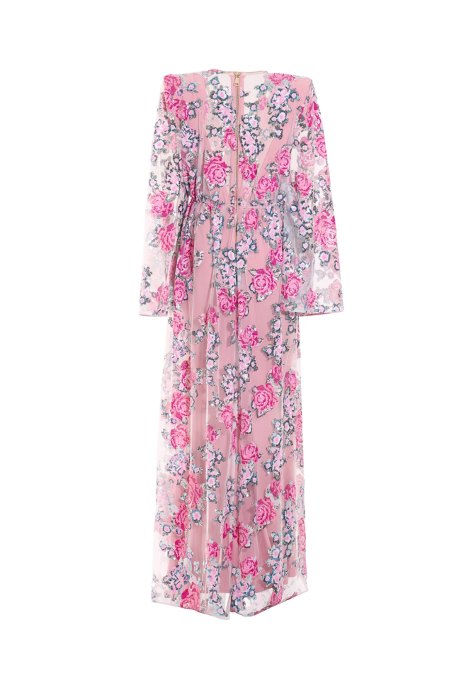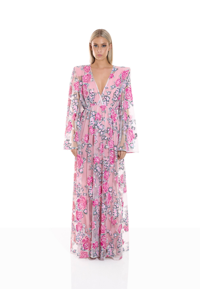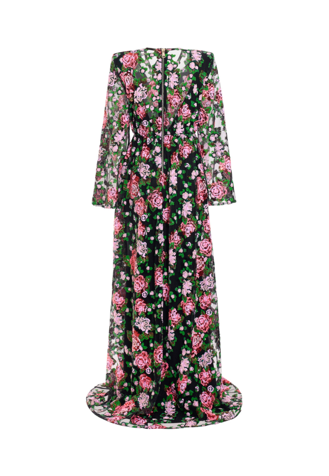 PARTIALLY LINED SEQUIN MESH GOWN WITH BELL SLEEVES, ELASTIC WAIST AND SHOULDER ACCENTS- FULL LENGTH SKIRT LINING