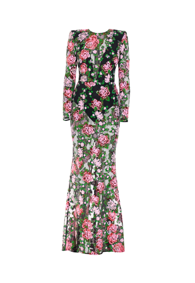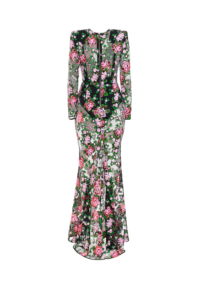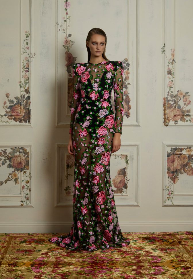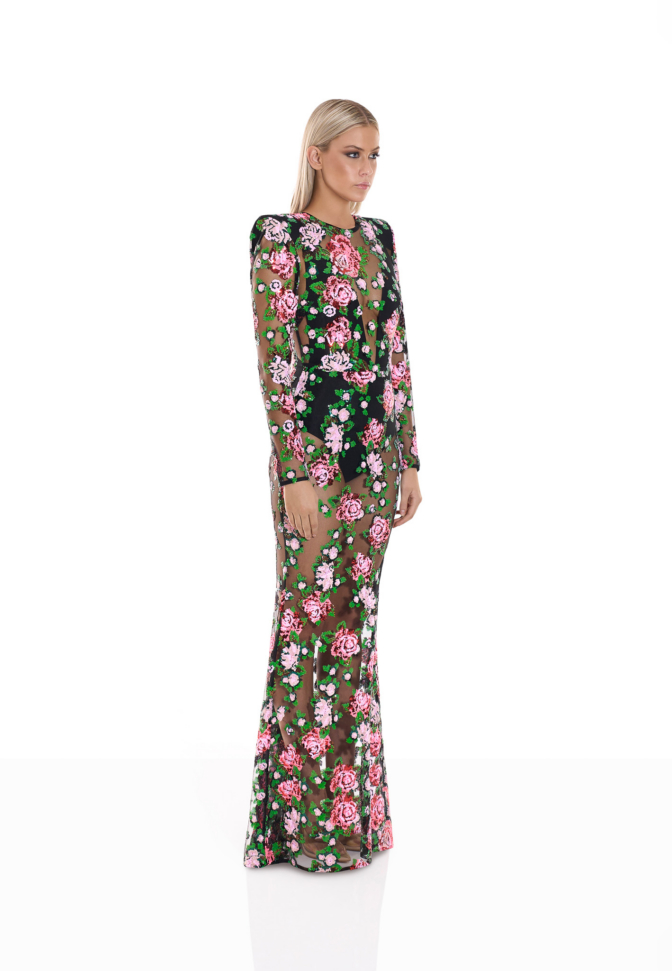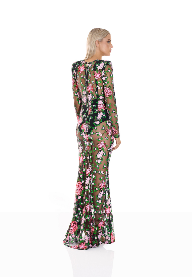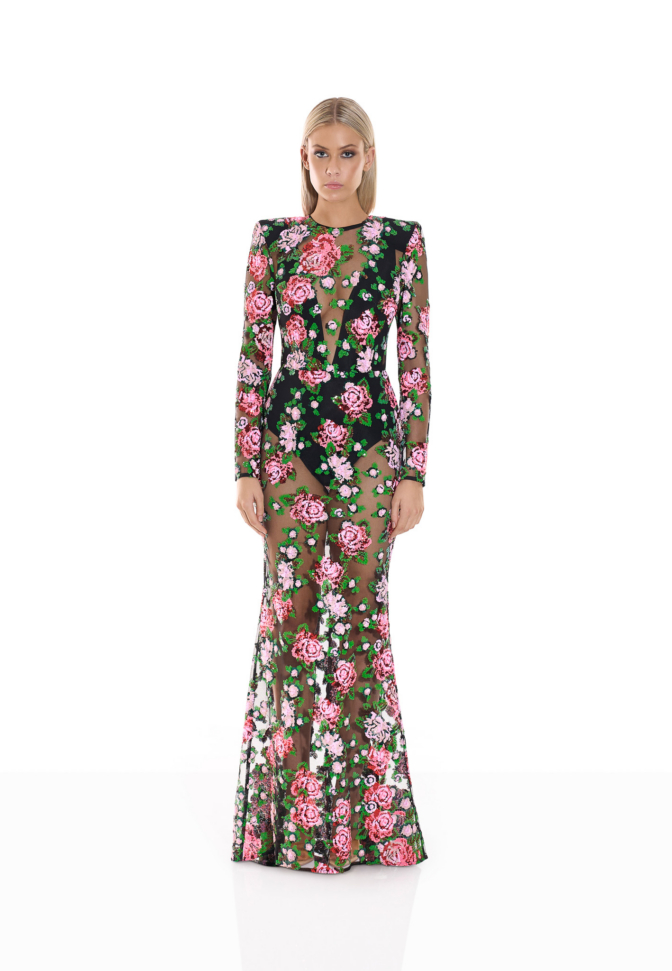 The Vista Fiorita 2-PC Gown is crafted in sheer sequin mesh, designed to capture light while maintaining sculptural precision. The long sleeve silhouette refines the frame with elongation and strength, while structured shoulder accents enhance proportion and introduce architectural clarity through the upper body.