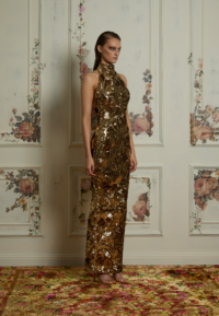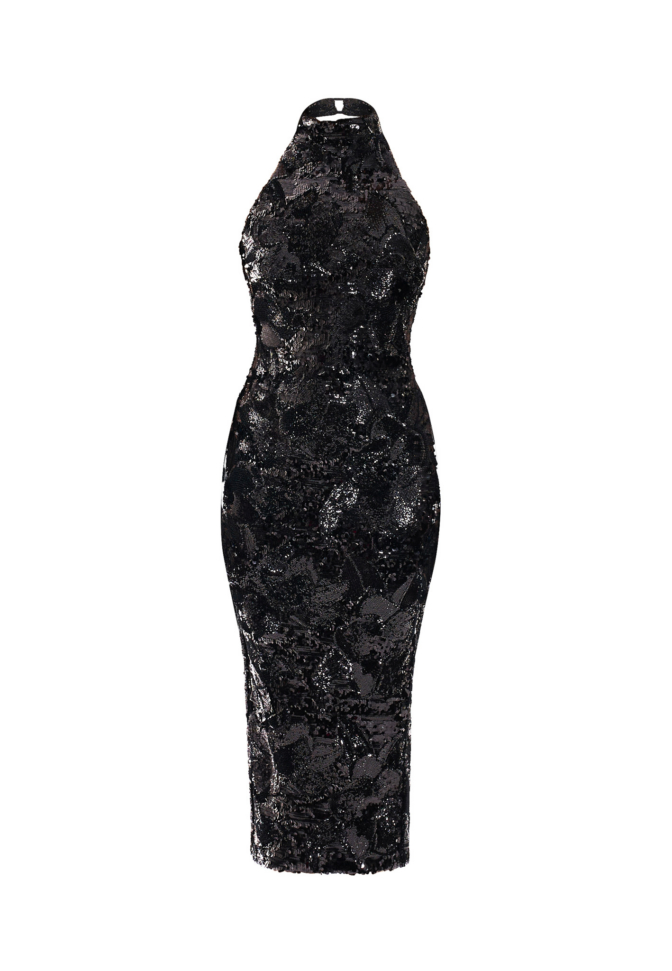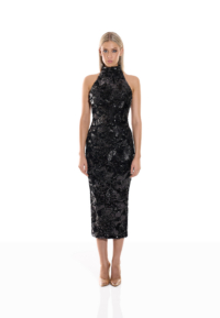 The Florentine Sunset Dress is designed to move with quiet confidence. The halter neckline refines the shoulders and frames the upper body with clean precision, creating a lengthened, sculpted line through the silhouette.
