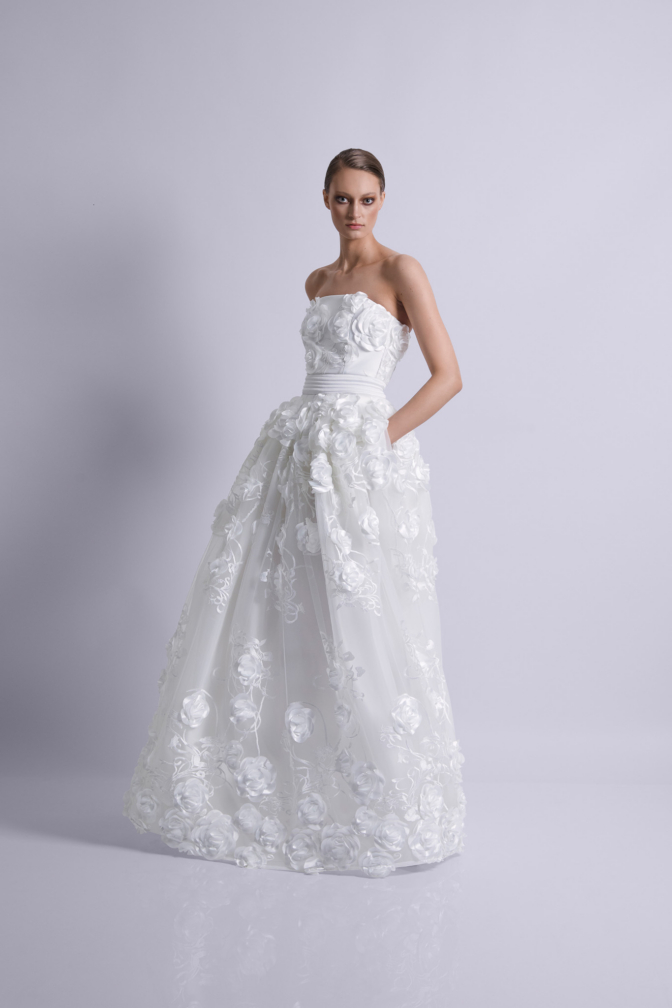 THIS GOWN IS DESIGNED TO BE REMEMBERED. THE STRAPLESS BODICE SCULPTS THE SILHOUETTE WITH PRECISION, WHILE DIMENSIONAL FLORAL APPLIQUÉ DRIFTS ACROSS SHEER, WEIGHTLESS LAYERS, CREATING DEPTH AND A SOFT PLAY OF LIGHT. THE FULL SKIRT MOVES WITH EFFORTLESS GRACE, TURNING EVERY STEP INTO SOMETHING QUIETLY UNFORGETTABLE.
