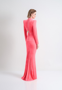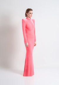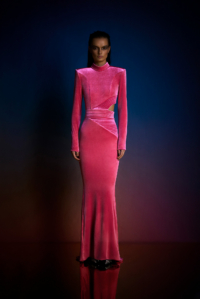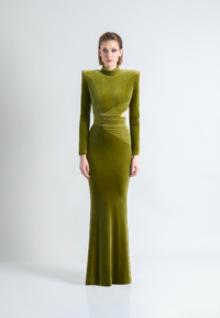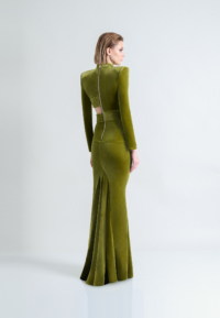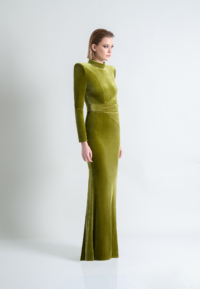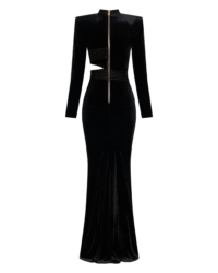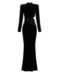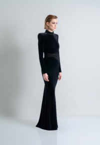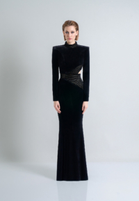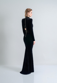 A FULLY LINED LONG SLEEVE VELVET GOWN WITH METALLIC STITCHED SATIN PANELS, SIDE BACK OPENING AND SHOULDER ACCENTS