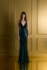 A SLEEVELESS STRETCH SEQUIN GOWN WITH STITCHED VELVET PANELS AND WAISTBAND