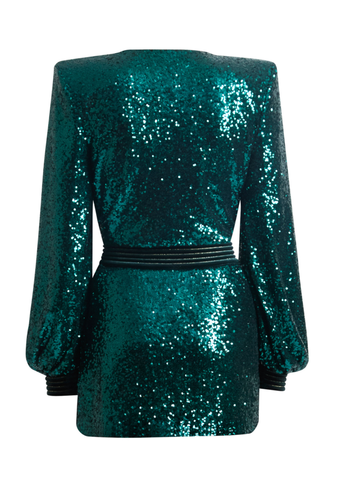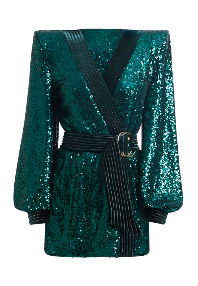 A STRETCH SEQUIN ROBE STYLE WRAP DRESS WITH STITCHED VELVET PANELS AND BELT