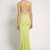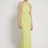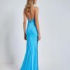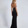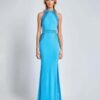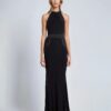 STRETCH JERSEY HALTER NECK GOWN WITH STITCHED SATIN PANELLING TO BODICE, NECK, WAISTBAND AND POCKET FACINGS.