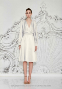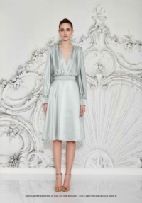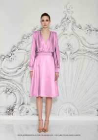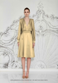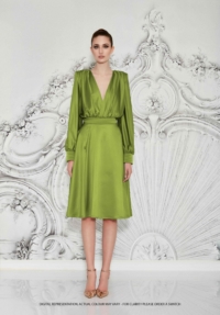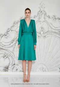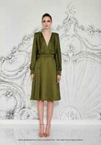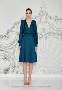 A STRETCH SATIN BIAS CUT MIDI DRESS WITH DRAPED BODICE, STITCHED SATIN WAISTBAND, BILLOWED SLEEVES, AND SHOULDER ACCENTS.