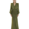 A STRETCH SATIN BIAS CUT GOWN WITH BILLOWED SLEEVES, SHOULDER ACCENTS, AND STITCHED SATIN PANELS.