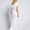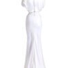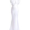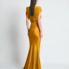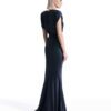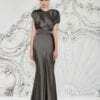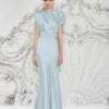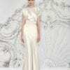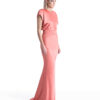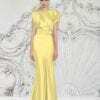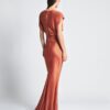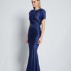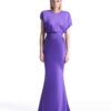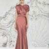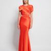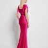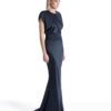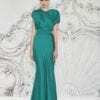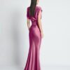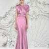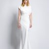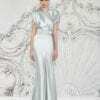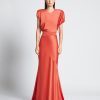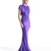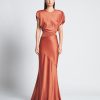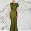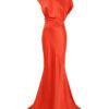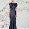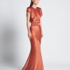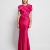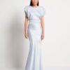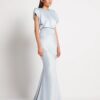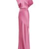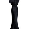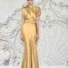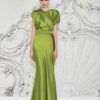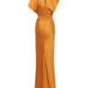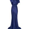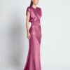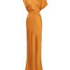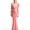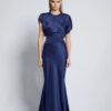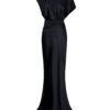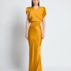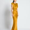 A STRETCH SATIN BIAS CUT GOWN WITH DRAPED BODICE, STITCHED WAISTBAND, DRAPED SKIRT, AND NATURAL SHOULDER ACCENTS.