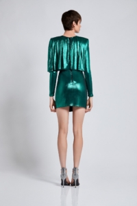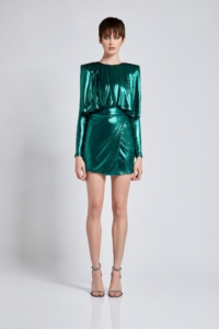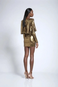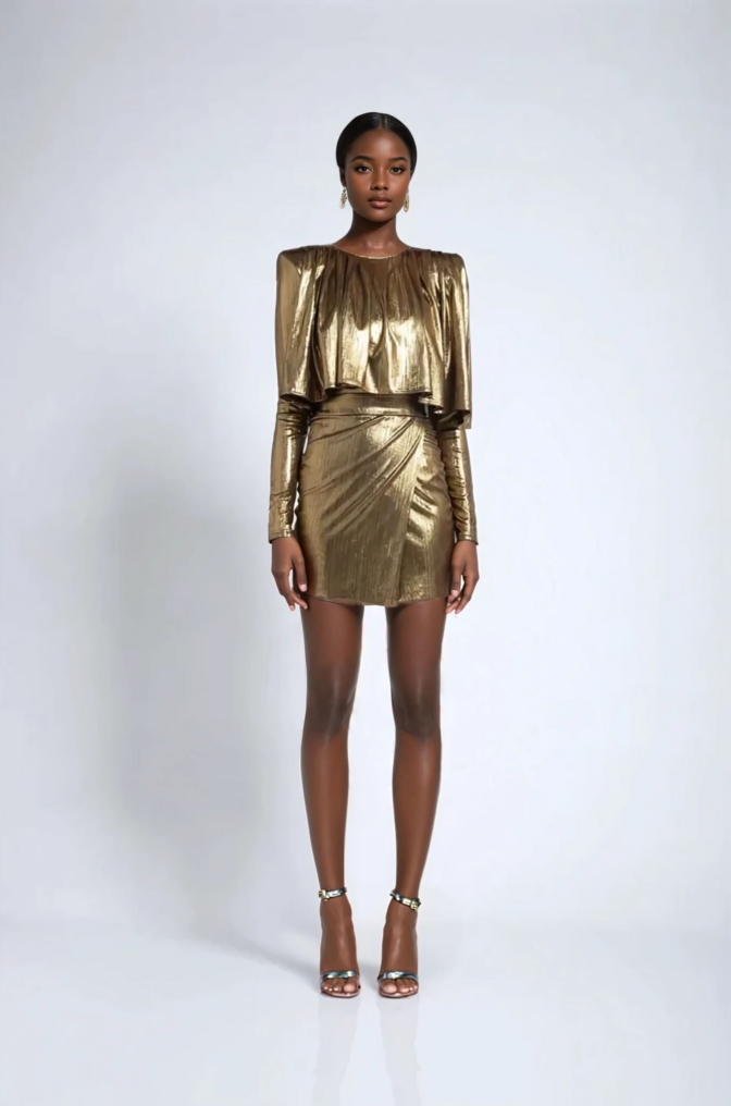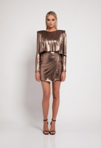 METALLIC STRETCH JERSEY DRESS WITH WEDGE SHOULDER ACCENTS, WRAP STYLE SKIRT AND DRAPED PLEATED FEATURE.