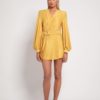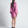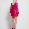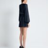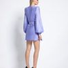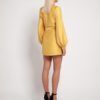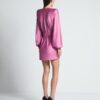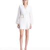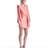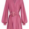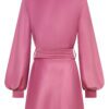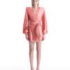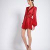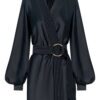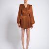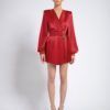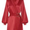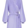 PARTIALLY LINED STRETCH SATIN ROBE STYLE WRAP DRESS WITH BUTTON & TIE CLOSURES AND STITCHED SATIN WAIST BELT. SHOULDER ACCENTS & BILLOWED SLEEVES.