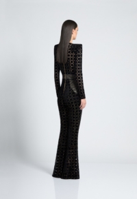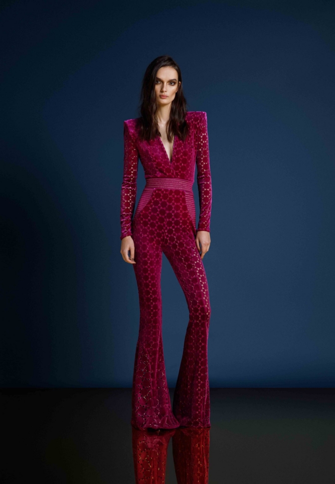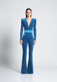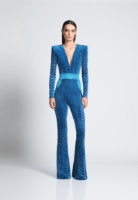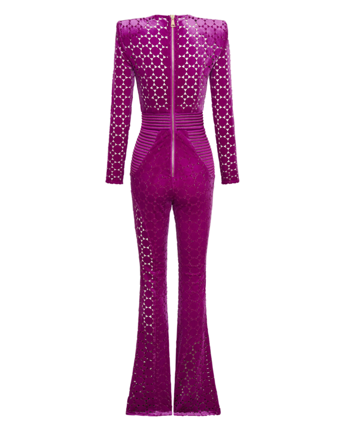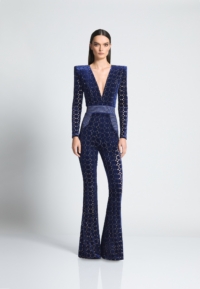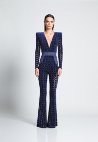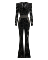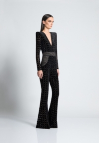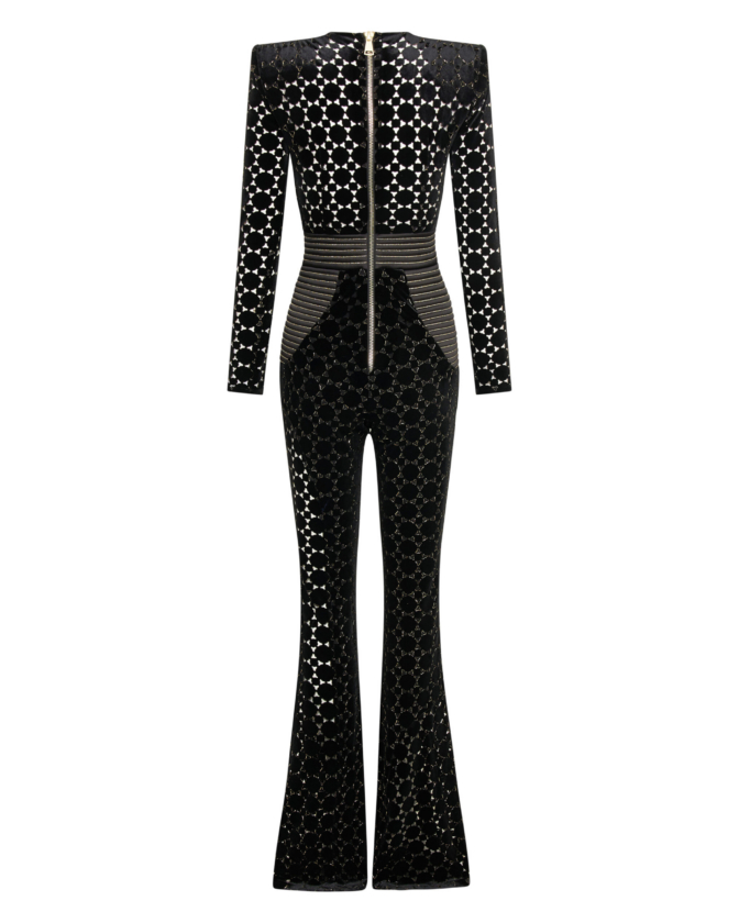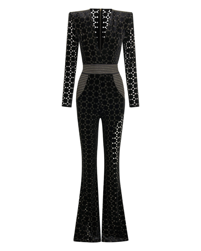 Introducing our CAVALIER jumpsuit, the perfect addition to your wardrobe for a stylish and effortless look. CRAFTED FROM A VELVET KNIT EXCLUSIVE ZHIVAGO FABRIC WITH LASER CUT SUTTLE GOLD DETAILS, this women’s jumpsuit offers both comfort and SOPHITICATION Designed with the utmost attention to detail THE SNATCHED WAISTBAND GIVES AN HOURGLASS SILHOUETTE WITH SIGNATURE STITCHED SATIN PANELING AND PLUNGING NECKLINE, it features a flattering silhouette that enhances your figure. PERFECT FOR a night out on the town, this jumpsuit is versatile enough to suit any occasion. A FAVORITE AMONGST CELEBRITIES Embrace the elegance and sophistication of the CAVALIER jumpsuit and step into fashion-forward style today.