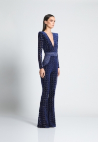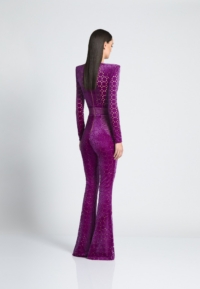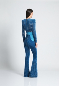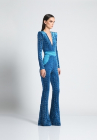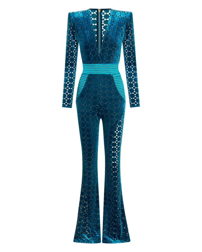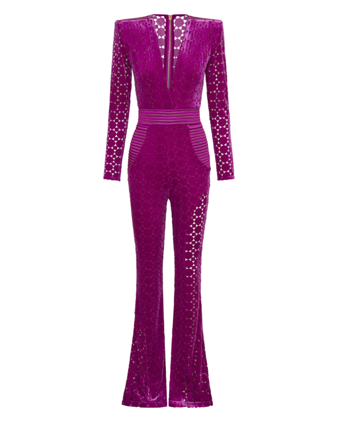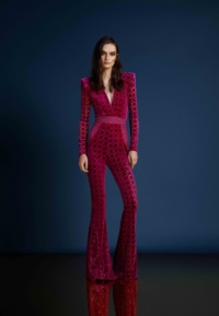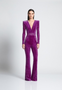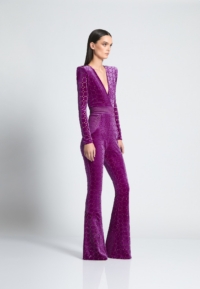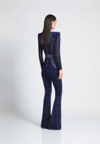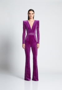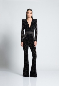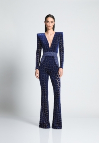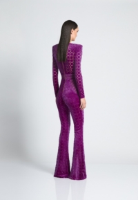 THE CAVALIER JUMPSUIT IS A VELVET FLARE LONG SLEEVE JUMPSIT WITH PLUNGING NECKLINE SNATCHED WAIST AND WEDGE SHOULDER ACCENTS.