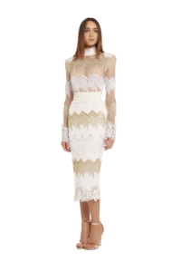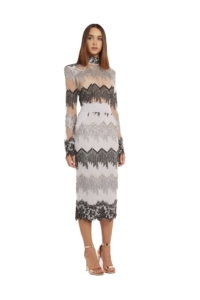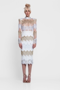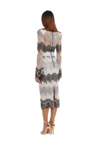 A PARTIALLY LINED EMBELLISHED MESH DRESS WITH SHOULDER ACCENTS AND SLIGHTLY FLARED SLEEVES. FEATURE EMBROIDERED HEM ON SKIRT AND SLEEVE.