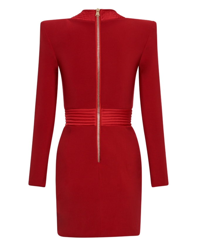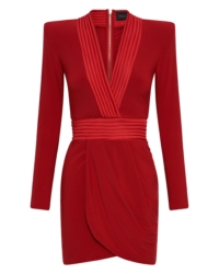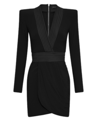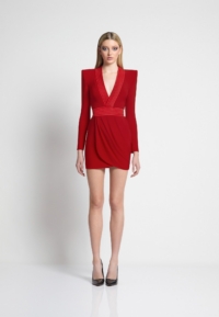 ONE OF OUR MOST ICONIC DESIGNS, THIS MINI LENGTH FULLY LINED STRETCH JERSEY DRESS HAS A PLUNGE FRONT NECKLINE WITH A STITCHED SATIN FEATURE AND SHOULDER ACCENTS. SKIRT IS A WRAP STYLE WITH A STITCHED SATIN WAISTBAND