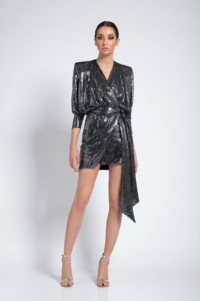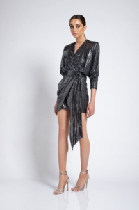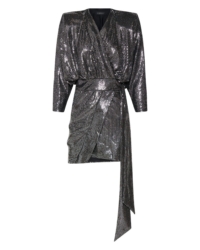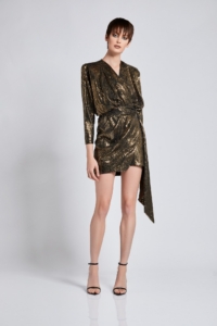 A FULLY LINED MINI LENGTH WRAP DRESS IN GILDED JERSEY WITH A SIDE TIE AND METAL BUTTON FASTENING
