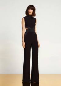 SIDE/BACK CUT OUTS WITH ZIP RUNNING THROUGH OPEN BACK. SATIN STRIPE ON PANT LEG