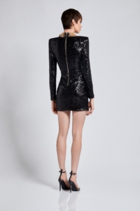 STRETCH SEQUIN MINI DRESS WITH GOLD CHAIN NECK DETAIL AND SHOULDER ACCENTS.
