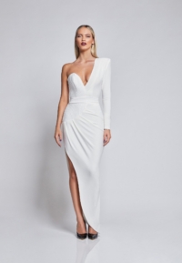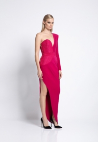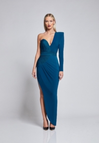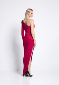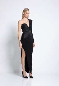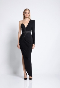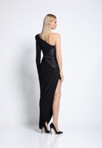 FULLY LINED JERSEY GOWN WITH STITCHED SATIN PANELLING, ASYMETRICAL STYLE SKIRT & SHOULDER ACCENTS.