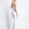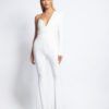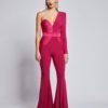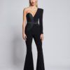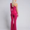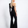 FULLY LINED JERSEY JUMPSUIT WITH CORSET STYLE ASYMETRICAL BUSTIER, STITCHED SATIN PANELLING, FLARED LEGS & SHOULDER ACCENT.