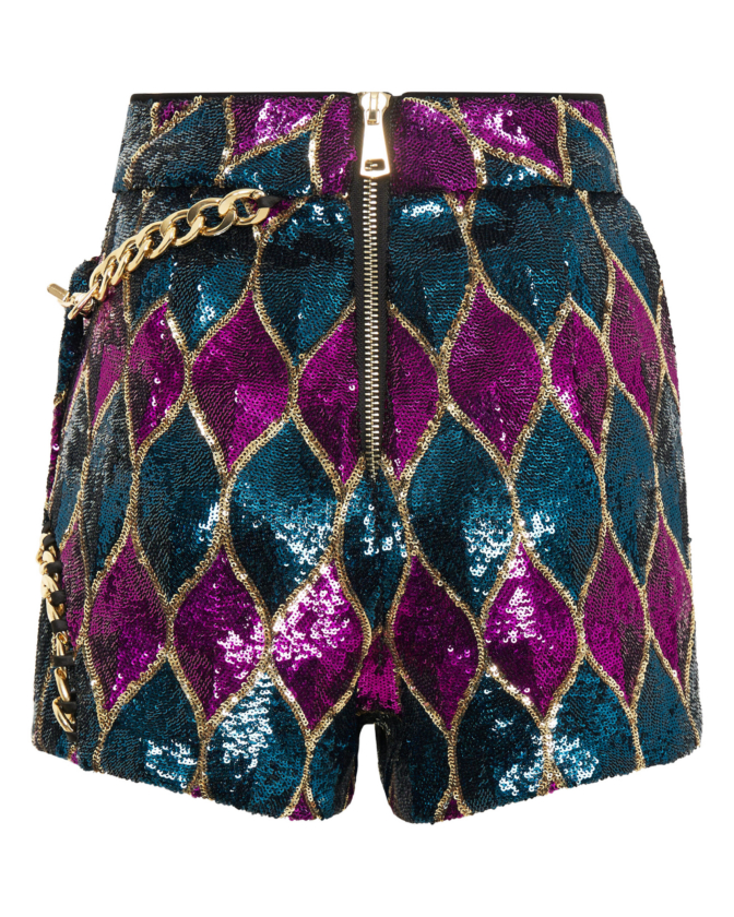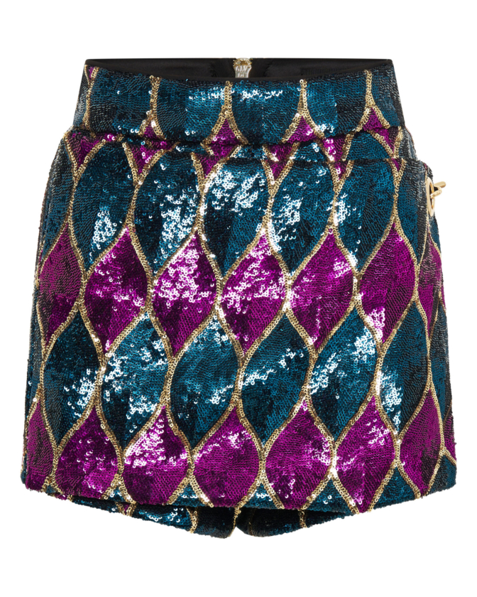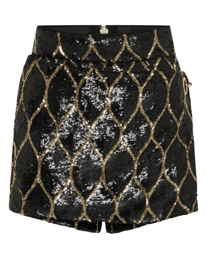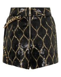 A FULLY LINED ZHIVAGO EXCLUSIVE FABRIC SEQUIN SKORT WITH CHAIN DETAIL.