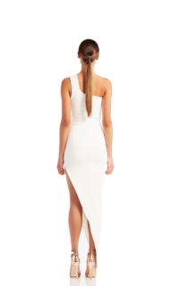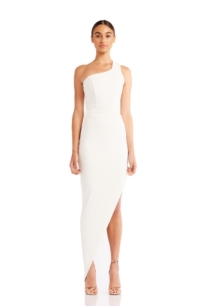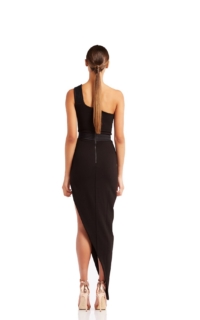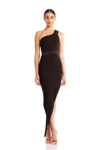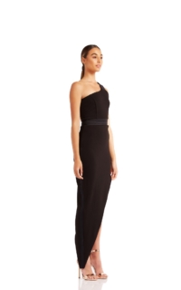 A FULLY LINED CREPE GOWN WITH STITCHED SATIN SHOULDER STRAP, WAISTBAND AND POCKET FACING. SATIN STRIPE FEATURE TO SKIRT.