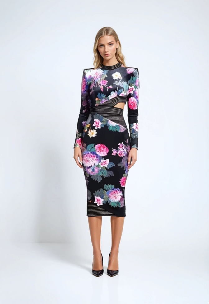 FULLY LINED LONG SLEEVE GILDED VELVET MIDI DRESS WITH METALLIC STITCHED SATIN PANELS, SIDE BACK OPENINGS & SHOULDER ACCENTS.