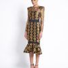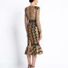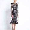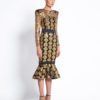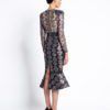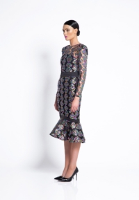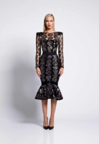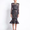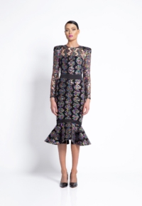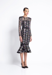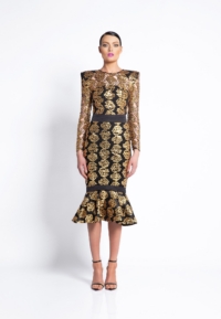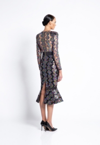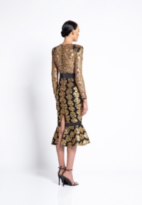 SEQUINED LACE CALF-LENGTH DRESS WITH LONG SLEEVES, SHOULDER ACCENTS, ELASTIC PANELS AND PEPLUM HEM