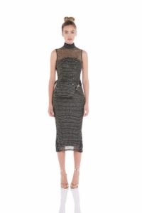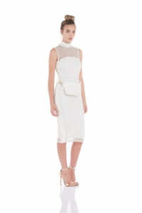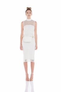 A WAFFLE MESH MIDI DRESS WITH GOLD STITCHED SATIN WAIST BAND, COLLAR AND SID STRIPE ON SKIRT. SHEER TOP BODICE. THE DETACHABLE MATCHING BAG WITH SATIN STRAP AND GOLD HARDWARE CAN BE WORN AROUND THE WAIST OR AS A SHOULDER BAG