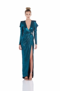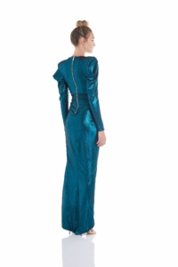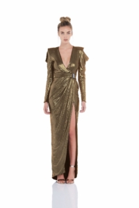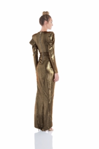 A FULLY LINED STRETCH METALLIC JERSEY GOWN WITH SHOULDER ACCENTS, PLUNGE NECKLINE, DRAPED SLEEVES AND BELT CLOSURE. OPTIONAL HOOK TO CLOSE FRONT SPLIT