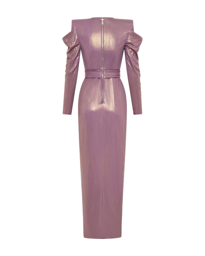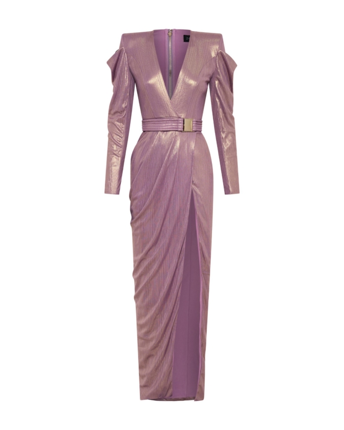 A FULLY LINED STRETCH METALLIC JERSEY GOWN WITH SHOULDER ACCENTS, PLUNGE NECKLINE, DRAPED SLEEVES AND BELT CLOSURE. OPTIONAL HOOK TO CLOSE FRONT SPLIT