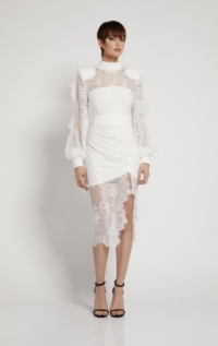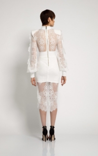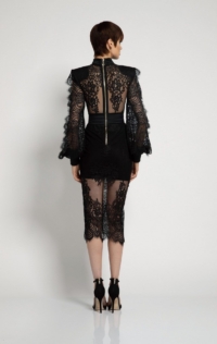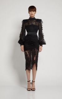TOMORROW LACE MIDI DRESS WITH PARTIAL BODICE LINING, SHOULDER ACCENT, STITCHED SATIN PANELLING AND SINGLE BOLLOW SLEEVE WITH OPEN RAW EDGE DETAILS.