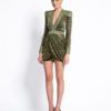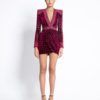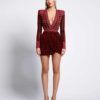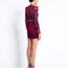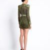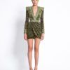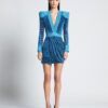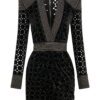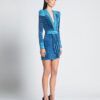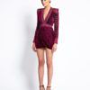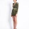 LASERCUT METALLIC VELVET MINI DRESS WITH WEDGE SHOULDER ACCENTS AND UNLINED WRAP STYLE SKIRT.